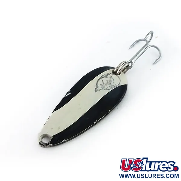 Die Prägung auf der polierten Nickel-Rückseite kennzeichnet diesen Blinker eindeutig als Eppinger-Original, markiert mit „DARDEVLE MIDGET U.S.A.“. Das kontrastreiche schwarz-weiß gestreifte Diagonalmuster auf der Vorderseite ist ein Klassiker in jeder gut sortierten Köderbox. Mit einer Länge von 3,5 cm (1 1/2") und einem Gewicht von 6 g (3/16 oz) ist dieses Modell ein Paradebeispiel für Köder mit kleinerem Profil, die ideal für das Fischen an feinem Gerät sind. Auf dem mittleren weißen Streifen ist die ikonische Teufelskopf-Grafik detailgetreu abgebildet. Die Hardware ist robust und umfasst einen Sprengring sowie einen scharfen Drillingshaken. Mit einer Bewertung von 5/5 ist der Zustand hervorragend; lediglich am Öhr für die Schnurbefestigung zeigt sich ein minimaler Lackabrieb, während die Nickel-Rückseite ihren spiegelnden Glanz bewahrt hat. Die lange Geschichte von Eppinger aus Michigan zeigt sich in der Qualität der Metallverarbeitung, die mit speziellen, hauseigenen Matrizen gefertigt wurde. Dieses Farbschema wurde gezielt für hohe Sichtbarkeit bei unterschiedlichen Lichtverhältnissen gewählt und bleibt ein Favorit für alle, die das Erbe von Lou Eppinger schätzen, das 1906 in seinem Keller seinen Anfang nahm. Die konkave Form des Metallkörpers ist das unverwechselbare Markenzeichen der Produktion aus der Fabrik in Dearborn.