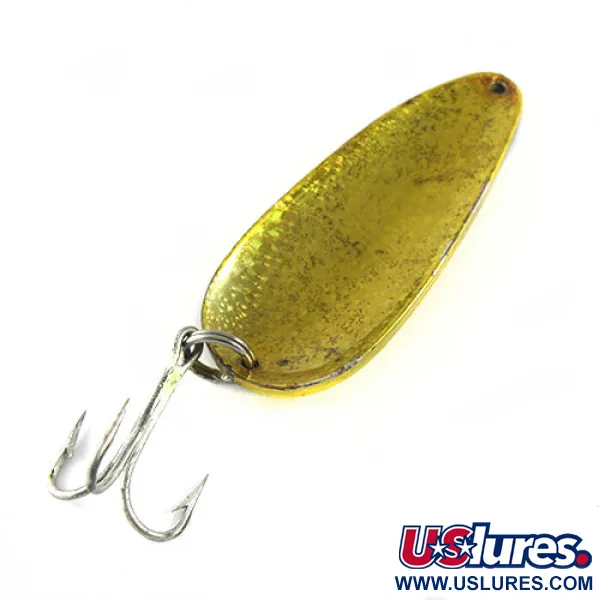 Gehämmerte Goldstrukturen schimmern auf der Oberfläche dieses Vintage-Exemplars und heben das klassische Crystal Golden Crystal-Farbmuster hervor. Mit einer Länge von 7 cm (2 3/4") und einem stattlichen Gewicht von 36 g (1 1/4 oz) ist dieser Dardevle Rok't Devle für maximale Wurfweite und Tiefe konzipiert. Eppinger fertigt diese Blinker seit 1906 mit firmeneigenen Matrizen an, um das ikonische konkave Profil zu erzeugen, das sie zu einem festen Bestandteil in Angelkisten in Michigan und sogar in militärischen Überlebenskits gemacht hat. Dieser spezielle Blinker mit dem Produktcode 0651 trägt die Prägung "ROK'T" auf der Vorderseite. Das Metallfinish zeigt leichte Altersspuren mit ein paar kleinen dunklen Flecken, behält aber einen schönen Glanz, was ihm eine Zustandsbewertung von 4/5 einbringt. Er ist mit einem großen, originalen silberfarbenen Drilling an einem robusten Sprengring ausgestattet und verfügt über eine einzelne Öse am verjüngten Ende.
