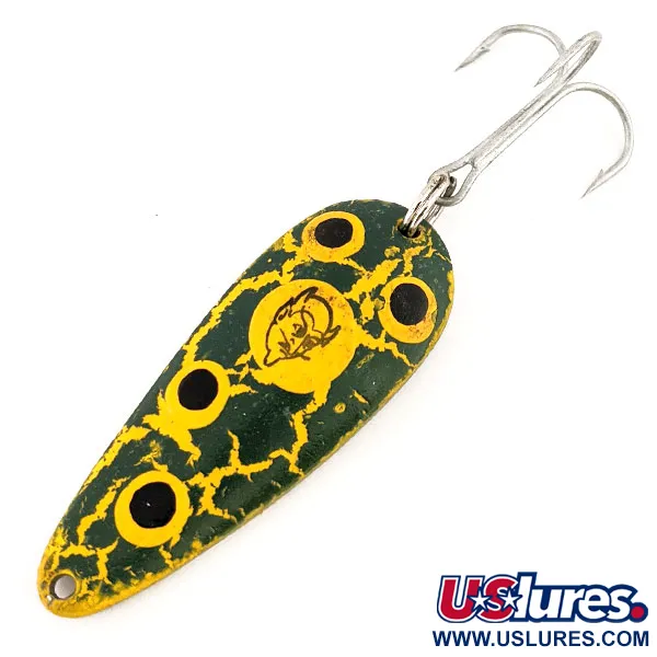 Ein grün-gelbes „Frog“-Crackle-Finish kennzeichnet diesen 7 cm (2 3/4") langen Blinker, der vier gelbe Ringe mit schwarzen Zentren aufweist, die eine zentrale gelbe Scheibe umgeben. Diese zentrale Scheibe zeigt das ikonische Eppinger Teufelskopf-Logo, ein Qualitätsmerkmal der Wurzeln des Unternehmens in Detroit und Dearborn, Michigan. Das Umdrehen des Köders enthüllt eine saubere, polierte Silberoberfläche, in die ROK'T-DEVLE, IMP und U.S.A. eingeprägt sind. Mit einem Gewicht von 21 g (3/4 oz) ist dieses Modell für das Wurfangeln unter verschiedenen Bedingungen konzipiert, bei denen ein schwereres Profil vorteilhaft ist. Die Hardware besteht aus einem stabilen Drilling, der über einen robusten Sprengring am Ende befestigt ist. Dieser Artikel befindet sich in einem 5/5 Zustand und ist bemerkenswert gut erhalten, mit leuchtenden Farben und scharfen Prägungen auf der Rückseite. Der spezifische Produktcode für dieses Vintage-Stück lautet 12704.