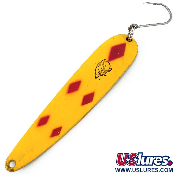 Fünf rote Rauten auf einer leuchtend gelben Emaillierung kennzeichnen diesen 10 cm (4") langen Wurfblinker als ein bedeutendes Stück amerikanischer Angelgeschichte. Auf der messingfarbenen Rückseite sind der Name „SEADEVLET“ und die Herkunft „DETROIT, U.S.A.“ deutlich eingeprägt. Dieses Exemplar mit der Artikelnummer 14918 wiegt 40 g (1 1/3 oz). Das klassische Teufelskopf-Logo von Eppinger ist auf der konkaven Vorderseite zwischen den oberen Rautenmustern scharf abgebildet. Dieser aus starkem Metall gefertigte Köder ist mit einem stabilen Einzelhaken an einem robusten Sprengring ausgestattet – eine Montage, die für ihre Langlebigkeit beim Schleppangeln oder tiefen Werfen geschätzt wird. Aus Sammlersicht ist das Finish außergewöhnlich gut erhalten und weist nur minimale Altersspuren auf, was eine Zustandsbewertung von 5/5 rechtfertigt. Das Seadevle-Design repräsentiert ein spezielles Kapitel der Detroiter Tradition des Herstellers und nutzt ein schmaleres, länglicheres Profil als der Standard-Dardevle, um tiefere Wasserschichten zu erreichen.