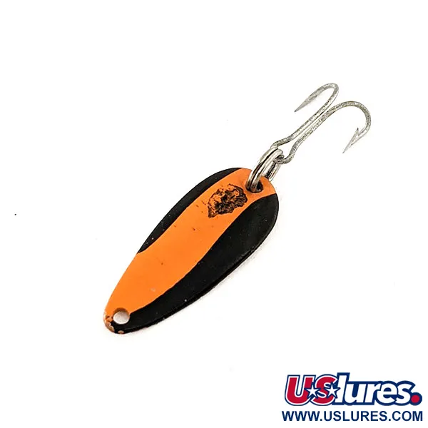 Kupferfarbenes Metall auf der Rückseite dieses winzigen 2,3 cm (1") Blinkers bildet einen warmen Kontrast zum kräftigen Emaille auf der Vorderseite. Die Rückseite ist deutlich mit „DARDEVLE SKEETER U.S.A.“ gestempelt und zeugt von der Tradition des in Michigan ansässigen Unternehmens von Lou Eppinger, das diese Köder seit 1906 herstellt. Mit einem Gewicht von filigranen 1 g (1/32 oz) weist dieses Exemplar ein markantes schwarzes Finish auf, das von einem leuchtend orangen Diagonalstreifen durchzogen wird. Diese spezielle Farbpalette wird von Anglern oft wegen ihrer Fähigkeit geschätzt, bei unterschiedlichen Sichtverhältnissen eine kontrastreiche Silhouette zu erzeugen. Das Emaille weist leichte, charaktervolle Gebrauchsspuren in der Nähe der Öse auf, was für authentische Vintage-Stücke aus dieser Ära typisch ist. Er ist mit einem scharfen Drilling ausgestattet, der durch einen Sprengring an der Basis gesichert ist. Mit einem Zustand von 5/5 behält der Köder seine strukturelle Integrität und sein lebendiges Finish. Sammler können dieses spezielle Modell anhand des Produktcodes 11630 identifizieren. Diese ultraleichten Blinker wurden traditionell für das Auswerfen auf Barschartige oder Forellen an feiner Schnur entwickelt.