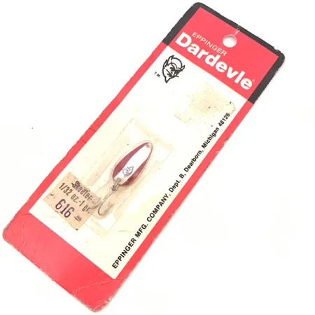 Ein extrem geringes Gewicht von 1/32 oz (1 g) zeichnet diesen ultraleichten Skeeter Blinker aus, ein fester Bestandteil des Eppinger-Sortiments seit dem Umzug des Unternehmens nach Dearborn, Michigan. Gefertigt mit der ikonischen rot-weiß gestreiften Emaillierung, misst der gestanzte Metallkörper exakt 1 Zoll (2,3 cm) und trägt das geschützte Teufelskopf-Logo. Dieses Exemplar mit der Artikelnummer 3912 ist unbenutzt und befindet sich sicher befestigt auf der originalen rot-weißen Verkaufskarte. Die Verpackung zeigt das klassische Branding der Eppinger Manufacturing Company mit der Adresse Schaefer Highway, ein Kennzeichen für die Produktion aus der Mitte bis Ende des 20. Jahrhunderts. Ausgestattet mit einem kleinen, werkseitig montierten Drillingshaken, ist die dünne Bauweise des Skeeter speziell für ultraleichte Wurftechniken auf Forellen und Barsche konzipiert. Die Karte weist sogar noch einen alten Händlerstempel mit der Nummer 616 auf, was einen Einblick gibt, wie diese Köder vor Jahrzehnten in den Angelläden kategorisiert wurden.