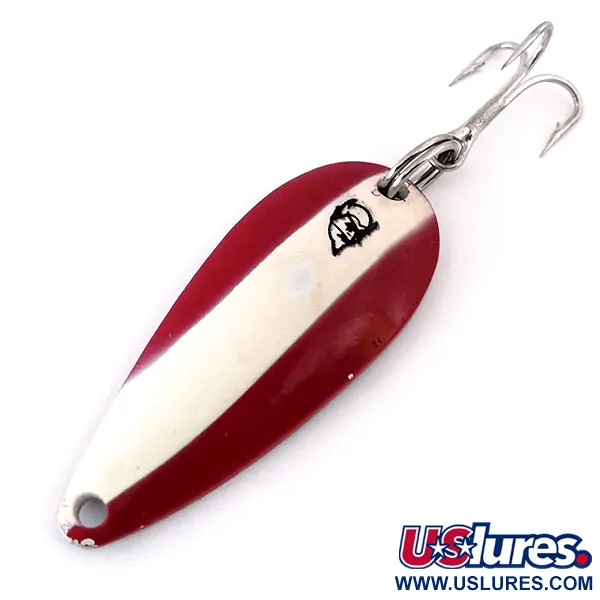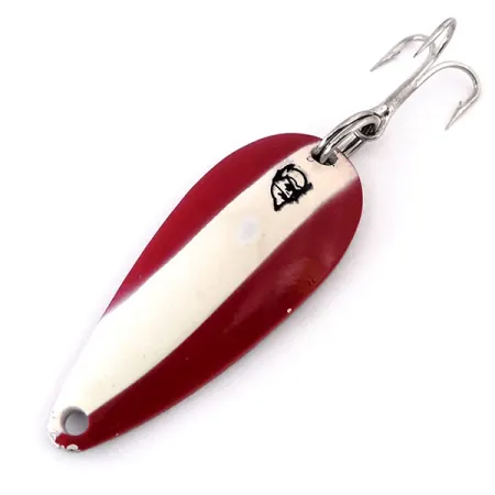 Poliertes Nickel bedeckt die Rückseite dieses 9g (1/3 oz) Löffelblinkers, der den ikonischen eingestanzten Markennamen und die Herkunftsbezeichnung „U.S.A.“ trägt. Mit einer Länge von 4,5 cm (1 3/4") präsentiert der Dardevle Spinnie (Art.-Nr. 10302) das klassische rot-weiße Diagonalgittermuster, das seit Lou Eppingers ersten handgefertigten Ködern in Detroit ein fester Bestandteil vieler Angelboxen ist. Die lackierte Seite ist mit einem kleinen schwarzen Teufelskopf-Logo in der Nähe des Sprengrings versehen. Dieses Exemplar befindet sich im Zustand 5/5 und weist die lebhaften Pigmente und die hochglänzende Beschichtung auf, die man von einem gut erhaltenen Eppinger-Oldtimer erwartet. Die konkave Form und der beschwerte Körper des Spinnie wurden für das Werfen oder Schleppfischen entwickelt und sorgen für die charakteristische Taumelbewegung, die den Ruf des Unternehmens nach seiner Gründung im Jahr 1906 begründete. Die Hardware ist robust und verfügt über einen silberfarbenen Drillingshaken, der durch einen Sprengring gesichert ist. Diese Größe ist besonders effektiv für Barschartige oder Forellen und spiegelt die Fertigungsstandards wider, die in der Fabrik in Dearborn, Michigan, nach wie vor gepflegt werden.