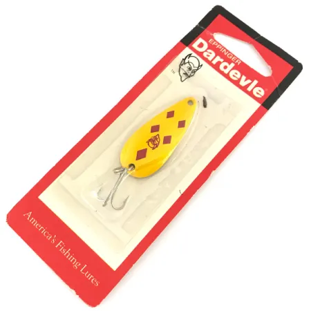 Fünf kastanienbraune Rauten auf gelbem Grund kennzeichnen diesen Dardevle Spinnie im legendären „Five of Diamonds“-Dekor. Dieser Wurfblinker aus Metall mit der Artikelnummer 7608 wiegt 1/4 oz (7 g) und ist 1 3/4" (4,5 cm) lang. Die Vorderseite des Köders ist mit dem markentypischen Teufelskopf-Logo geprägt, ein Symbol für die Wurzeln der Marke Eppinger in Michigan. Dieses Exemplar ist unbenutzt und befindet sich in der Originalverpackung aus Dearborn, Michigan, inklusive der klassischen rot-weißen Header-Karte. Der einzelne Drillingshaken ist werkseitig montiert, und das Originaletikett auf der Kartonrückseite weist das Gewicht von 7 g (1/4 oz) aus. Dieser Köder verkörpert die traditionellen Herstellungsmethoden, die Eppinger seit 1906 für seine Blinker-Designs anwendet.