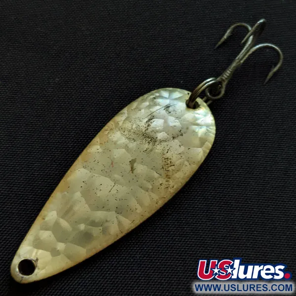 Gehämmerte Metallfacetten fangen das Licht auf dem einzigartigen Crystal-Finish dieses klassischen Blinkers aus amerikanischer Herstellung ein. Auf der Rückseite sind die Herstellermarke sowie „SPINNIE U.S.A.“ deutlich eingeprägt; dieser Eppinger Dardevle mit dem Produktcode 18714 verkörpert das Erbe, das Lou Eppinger 1906 begann. Dieses Exemplar misst 4,5 cm (1 3/4") und wiegt 9 g (1/3 oz), was es zu einer soliden Wahl für verschiedene Süßwasser-Raubfische beim Spinnfischen macht. Der Zustand ist eine solide 4/5, was sich in einer sauberen Oberfläche und einem stabilen Drilling zeigt, der sofort einsatzbereit ist. Eppinger verwendet eigene Prägestempel, um die spezifische längliche Form und das konkave Profil zu erreichen, die für das taumelnde Laufverhalten des Köders beim gleichmäßigen Einholen entscheidend sind. In klaren Gewässern sind die lichtreflektierenden Eigenschaften dieses speziellen Metallic-Finishs seit Generationen ein fester Bestandteil für Angler.