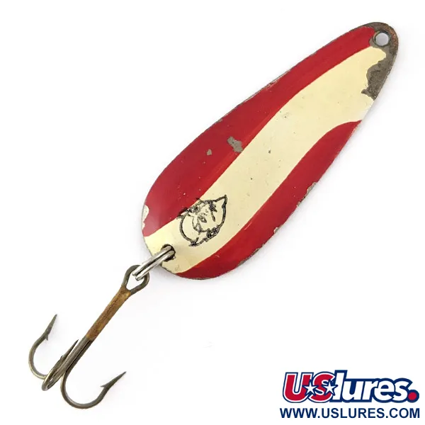 Dieses im ikonischen rot-weiß gestreiften Muster gehaltene, 5,5 cm (2 1/4") große Exemplar trägt das berühmte Teufelskopf-Logo, das deutlich auf der weißen Lackierung aufgedruckt ist. Identifiziert durch den Produktcode 22544, wiegt dieses „Imp“-Modell aus den 1950er Jahren 11 g (2/5 oz) und ist damit eine vielseitige Wahl für klassische Spinnfischer-Setups. Die Vorderseite zeigt ehrliche Gebrauchsspuren mit Lackabplatzungen an den Kanten und innerhalb der roten Streifen, die das Metall darunter freilegen und zu einer Zustandsbewertung von 4/5 führen. Auf der Rückseite ist das Metall mit „DARDEVLE'S“ „IMP“ U.S.A. gestempelt – ein Gütesiegel der von Lou Eppinger in Detroit gegründeten Firma. Die Montage besteht aus einem einzelnen Sprengring, der einen Drillingshaken mit leicht gealtertem Finish hält. Dieser spezifische Köder spiegelt die Produktionszeit vor dem Umzug des Unternehmens nach Dearborn im Jahr 1959 wider. Die konkave Form des Blinkerblattes ist für einen stabilen Lauf beim gleichmäßigen Einholen konzipiert – ein Markenzeichen des Eppinger-Designs seit der Einführung im Jahr 1906. Kleine Lackverluste an der Spitze und den Seiten bestätigen seine Geschichte in einer Angelkiste.