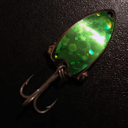 Grüne holografische Folienschuppen bedecken die Oberseite dieses 3 cm (1 1/4") langen Metall-Blades und sorgen für einen weithin sichtbaren, fluoreszierenden Blitzeffekt, der unter UV-Licht reagiert. Der in den USA von Fish Itt First Lure Co. gefertigte Double Dancer zeichnet sich durch ein markantes, gewichtetes Profil aus, das speziell für das Wurfangeln oder vertikale Jiggen entwickelt wurde. Ein poliertes Nickel-Finish auf der Unterseite kontrastiert mit dem leuchtend grünen Schuppenmuster und erzeugt einen scharfen visuellen Reiz. Dieses Exemplar mit dem Produktcode 12500 befindet sich in einem hervorragenden Zustand (Bewertung 5/5), wobei sowohl die Hardware als auch das Finish tadellos erhalten sind. Das Gewicht von 7 g (1/4 oz) ist zur Mitte hin konzentriert, was für Stabilität und hohe Wurfweiten sorgt. Die Schnurbefestigung an der schmalen Nase und der per Sprengring montierte Drilling am Schwanz sind Standard für dieses amerikanische Design – ein bestens erhaltenes Sammlerstück für Liebhaber fluoreszierender Vintage-Köder.