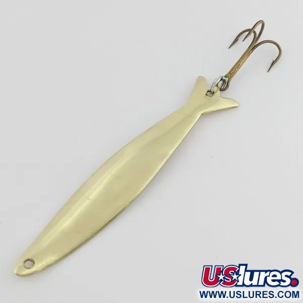 Die Messingoberflächen dieses Blinkers von Eagle Tool. inc. fangen das Licht mit einem warmen, natürlichen Glanz ein. Mit einem Gewicht von 3/16 oz (6 g) ist der Metallkörper für ultraleichte oder Spinnruten ausgelegt. Eine Länge von 2 3/4" (7 cm) verleiht dem Köder ein schlankes Profil, das das Wasser beim Einholen mühelos schneidet. Dieser spezielle Köder ist unbenutzt und weist keinerlei Gebrauchsspuren oder Wasserkontakt auf. Unter der Artikelnummer 24498 bietet der Köder ein einfaches, effektives Design, bei dem die Gewichtsverteilung für maximale Wurfweite optimiert wurde. Das Messing-Finish ist auf der gesamten Oberfläche sauber und gleichmäßig. Die Haken sind mit Standard-Hardware befestigt, wie sie für die damalige Produktion von Eagle Tool typisch war.