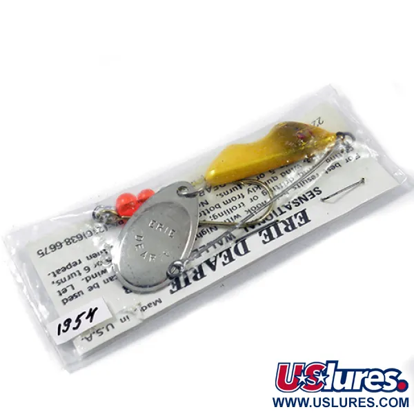 Mit einem Gewicht von 2/3 Unzen (18 g) verfügt dieser spezielle Walleye Killer über einen leuchtend gelben Bleikopf mit feinem Goldglitzer-Finish. Hergestellt in den USA von Erie Dearie, bleibt der Köder in seiner originalen Klarsichtverpackung und ist unbenutzt. Das gestanzte Nickelblatt zeigt deutlich den Markennamen, kombiniert mit einer Reihe leuchtend oranger Perlen, die zu einem scharfen Haken mit langem Schenkel führen. Die Gebrauchsanweisung auf der Rückseite empfiehlt, den Haken mit einem Tauwurm zum Driften oder Schleppangeln zu bestücken. Dieses Modell mit dem Produktcode 1954 ist ein klassisches Beispiel für das Weight-Forward-Spinner-Design, das am Eriesee legendären Status erlangte. Die Hardware besteht aus einem robusten Drahtgestell und einem großen, polierten Nickelblatt, das für die Präsentation in verschiedenen Tiefen konzipiert wurde.