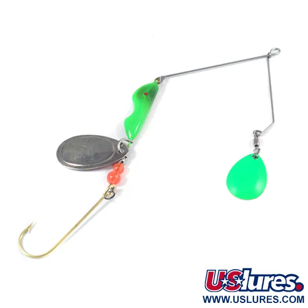Mit einem Gewicht von 16g (3/5 oz) verfügt dieser in den USA hergestellte Walleye Killer über einen markanten L-förmigen Drahtarm, der für das Schleppfischen im Tiefwasser oder das Werfen konzipiert ist. Das primäre Spinnerblatt mit Nickel-Finish ist deutlich mit dem Namen des Herstellers und einer Gewichtsangabe von 5/8 OZ geprägt und mit einem leuchtend neongrünen Gusskörper kombiniert. Ein zweites, kleineres grünes Teardrop-Blatt ist über einen Tönnchenwirbel am oberen Arm befestigt und sorgt für einen zweiten visuellen Kontrastpunkt. Unterhalb des Hauptkörpers führen zwei leuchtend orangefarbene Perlen zu einem goldfarbenen Haken, der sich in hervorragendem Zustand befindet. Dieses Exemplar im Zustand 5/5, identifiziert durch den Produktcode 2006, weist eine bemerkenswert saubere Hardware und Originallackierung im gesamten Nickel / Grün Farbschema auf.
