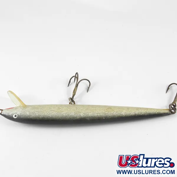 Glitzernde silberne und goldene Schuppen an den Flanken prägen dieses finnische Original. Mit einer Länge von 12 cm und einem Gewicht von 6 g weist der Köder ein schlankes, elritzenartiges Profil auf, das typisch für traditionelle europäische Designs ist. Finlandia Uistin, erkennbar an dem in Rot auf den Bauch gedruckten Stempel „MADE IN FINLAND“, hat dieses Modell in einem Natural-Farbschema veredelt. Der Farbverlauf wechselt von einem dunkelgrauen Rücken zu einem blasscremefarbenen Bauch, akzentuiert durch dichten Glitzer im Mittelbereich. Er verfügt über zwei bronzierte Drillingshaken und eine klare, flachlaufende Tauchschaufel aus Kunststoff, die für Wurf- oder Schleppanwendungen konzipiert ist. Dieser spezielle Köder, gelistet unter dem Produktcode 1294, behält eine Zustandsbewertung von 4/5 bei, wobei die Original-Hardware und das Finish weitgehend intakt sind.
