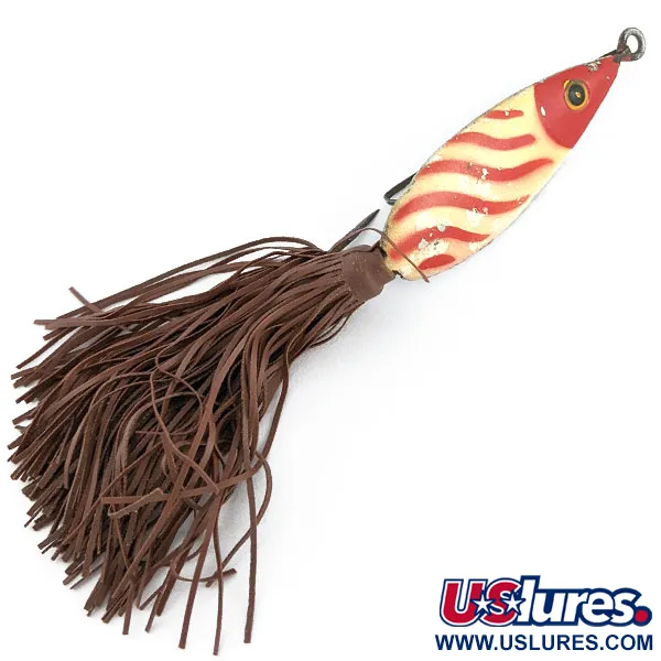 Schwer genug für die präzise Platzierung in Hindernissen, verkörpert dieser 16 g (3/5 oz) schwere Köder ein klassisches Stück amerikanischer Angelgeschichte aus den Werkstätten von Fred Arbogast. Das Dekor besticht durch einen kräftigen roten Kopf und einen Körper, der mit markanten, wellenförmigen roten Streifen auf silbernem Grund verziert ist. Mit einer Länge von 6 cm (2 1/4") trägt er den ikonischen braunen Gummifransenrock, der die Hula-Serie definierte und so erhalten wurde, dass er für die Präsentation geschmeidig bleibt. Unter dem Produktcode 22097 geführt, ist der löffelförmige Körper um einen einzelnen, nach oben gerichteten Krauthaken aufgebaut – eine Konstruktion, die speziell für das Fischen durch Seerosenfelder und dichte Vegetation entwickelt wurde. Dieses Exemplar befindet sich im Zustand 4/5 und weist leichte Oberflächenspuren auf, die seinen authentischen Vintage-Status unterstreichen, während die Farbintensität der Originallackierung erhalten bleibt. Das Auge ist detailreich mit einer goldenen Iris und einer schwarzen Pupille gestaltet, ein typisches Merkmal der US-Fertigung jener Ära.