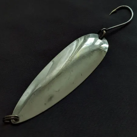 Die Gravur 'GIBBS SICAMOUS 4' auf der konkaven Seite des Metalls kennzeichnet diesen klassischen Schlepplöffel eines namhaften Herstellers. Das hochglanzpolierte Nickel-Finish reflektiert das Licht auf der gesamten Länge von 10 cm (4") und sorgt so für eine effektive Lockwirkung bei unterschiedlichen Sichtverhältnissen. Mit einem Gewicht von 17 g (3/5 oz) weist dieses Exemplar mit dem Produktcode 21433 die traditionelle Tropfenform auf, die typisch für die in den USA gefertigten Köder von Gibbs ist. Zur Ausstattung gehören dunkel beschichtete Sprengringe an beiden Enden sowie ein großer, scharfer Einzelhaken, der speziell für das Schleppfischen montiert ist. Sein schlanker, länglicher Körper ist charakteristisch für die Sicamous-Serie, die von Sammlern für ihre schlichte, aber effektive Verarbeitung geschätzt wird. Die Oberfläche weist kaum Handhabungsspuren auf und erhält eine Bewertung von 5/5 für den hervorragend erhaltenen Glanz. Die dunklen Sprengringe bilden einen starken Kontrast zur hellen, spiegelnden Nickelbeschichtung des Löffelblattes.