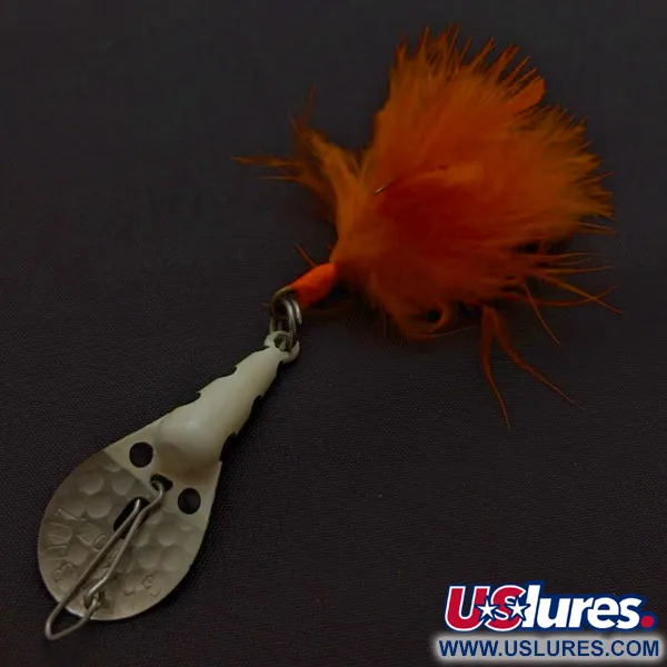 Schwarze Punkte auf weißer Emaille bilden einen markanten Kontrast zum gestanzten Metallkörper dieses 1/4 oz (7 g) schweren Köders. Glen Evans verwendete für den Gad-About eine charakteristische zweiteilige Konstruktion mit einem vorderen Löffelbereich aus Metall, in den Marken- und Modellname eingestempelt sind. Am Heck ist ein üppiger Busch orangefarbener Federn mit passendem orangefarbenem Faden an den Haken gebunden, der sein volles Profil behält. Bei einer Länge von 2" (5 cm) bleiben die Beschläge glänzend und frei von Oxidation. Dieses Exemplar befindet sich in einem 5/5-Zustand, wobei Lackierung und Federn wie am Tag der Herstellung wirken.