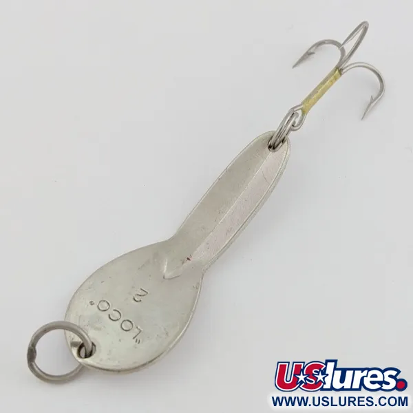 Auf der Rückseite deutlich mit „LOCO“ 2 gestempelt, zeigt dieser 1/4 oz (7 g) Blinker die klassische Offset-Biegung, die Glen Evans ursprünglich auf den Markt brachte. Der 2" (5 cm) lange, vernickelte Körper verfügt über eine ausgeprägte Tropfenform, die in einen schmaleren Hals übergeht – ein Profil, das für Präsentationen im Flachwasser bis zu einer Tiefe von 1 m ausbalanciert ist. Lichtreflektierende, holografische Schachbrett-Einsätze sind sowohl auf dem Blatt als auch im oberen Bereich angebracht und sorgen für ein facettenreiches Aufblitzen, das Bisse in stehenden Gewässern oder entlang von Krautkanten provozieren soll. Dieses im Zustand 5/5 erhaltene Exemplar weist ein glänzendes Nickelfinish und den originalen gelben Schlauch über dem Drillingsschaft auf. Obwohl später von Luhr Jensen hergestellt, ist diese Glen Evans Version ein sauberes Beispiel für das frühe Produktionsdesign. Die Gewichtsverteilung begünstigt eine stabile Köderführung beim Wurf gegen Strukturen oder beim gleichmäßigen Schleppen. Produktcode: 24528.