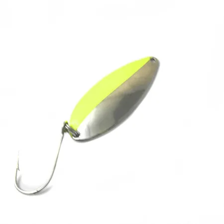 Eine Vernickelung kombiniert mit einem leuchtend grünen Streifen bestimmt die Ästhetik dieses klassischen amerikanischen Blinkers. Mit einer Länge von 5,5 cm (2 1/4") und einem Gewicht von 11 g (2/5 oz) ist dieses Modell von Great Lakes Lures (Produktcode 0435) ein klassisches Beispiel für US-Handwerkskunst. Die Konstruktion besteht aus einem gestanzten Metallkörper mit einer polierten Nickel-Unterseite, während die Oberseite in blankes Metall und einen hellgrün lackierten Bereich unterteilt ist. Dieses Exemplar weist ein gut erhaltenes Finish auf, was eine Zustandsbewertung von 4/5 rechtfertigt, wobei nur leichte Oberflächenspuren auf den reflektierenden Bereichen sichtbar sind. Der Einzelhaken ist sicher über einen robusten Sprengring am Ende befestigt, der für das Werfen oder Schleppen im Freiwasser vorgesehen ist. Dieses zweifarbige Finish bietet einen deutlichen visuellen Kontrast zwischen dem stark reflektierenden Nickel und dem Akzent des grünen Streifens.