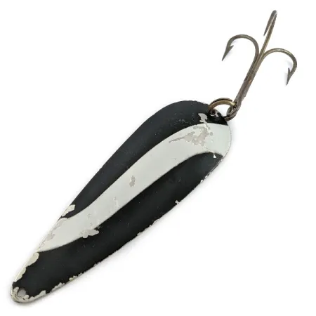 Mit einer Länge von 8,5 cm (3 1/4") trägt dieser aus Metall gestanzte Blinker aus den USA die charakteristischen Gypsy King-Markierungen. Die Vorderseite ist mit einem kontrastreichen schwarz-weißen Wellenmuster auf einer Nickelbasis versehen, wobei sichtbare Gebrauchsspuren vorhanden sind, die der Zustandsbewertung 4/5 entsprechen. Beim Wenden des Köders zeigt sich eine polierte Nickel-Rückseite, in die der Name Gypsy King 2 deutlich eingraviert ist. Dieser Weller-Blinker, identifiziert durch den Produktcode 19599, ist weiterhin mit seinem originalen, robusten Drillingshaken und dem Sprengring ausgestattet. Die Tropfenform und das beachtliche Gewicht von 21 g (3/4 oz) sind Kennzeichen eines Köders, der für das Distanzwerfen oder das Schleppfischen im Tiefwasser ausgelegt ist. Geringfügiger Lackverlust an den Rändern verleiht diesem Sammlerstück aus der Mitte des letzten Jahrhunderts Authentizität, ohne die Stabilität zu beeinträchtigen.