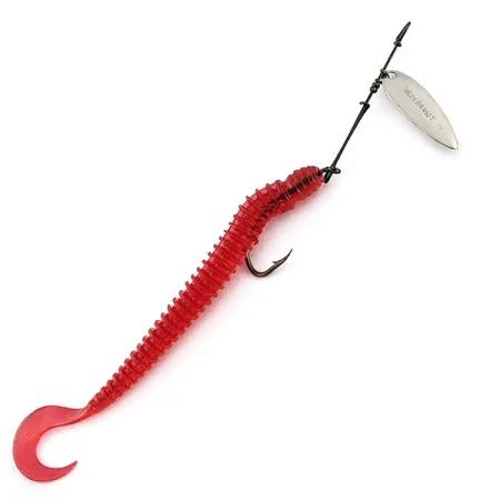 Ein klassisches, vernickeltes Weidenblatt, das deutlich mit dem Namen Hildebrandt geprägt ist, dient als Hauptlockmittel für dieses 20404 Rig. Mit einem Gewicht von 3/16 oz (4,5 g) kombiniert diese Montage einen traditionellen Spinnerarm mit einem lichtdurchlässigen roten Gummikörper. Dieser 15 cm lange, gerippte Twister ist auf einem Einzelhaken montiert und bietet ein markantes Profil für Würfe in unterschiedlichsten Gewässerstrukturen. Hergestellt in den USA von Hildebrandt Spinners, überzeugt die Hardware durch präzise Drahtwicklungen und ein hochwertiges Finish des Blattes. Das Modell befindet sich in einem Zustand von 5/5, wobei die Vernickelung das Licht klar reflektiert und das rote Material seine ursprüngliche Flexibilität bewahrt hat. Der Haken ist scharf und sitzt fest in den gerippten Segmenten des Gummikörpers.