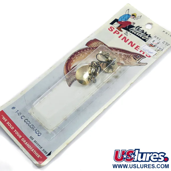 Die Goldauflage auf dem Spinnerblatt dieses kleinen Spinners im Colorado-Stil ist nach wie vor brillant und reflektierend und fängt das Licht genau so ein, wie sie es vor Jahrzehnten getan hätte. In der originalen Vintage-Blisterverpackung präsentiert, ist dieses Exemplar ein bestens erhaltenes Zeugnis des anglerischen Erbes aus Indiana. Der Zustand ist unbenutzt, wobei das Zubehör und das Goldfinish im werksseitigen Originalzustand erhalten sind. Die John J. Hildebrandt Corp., einst in Logansport, Indiana, ansässig, druckte ihren berühmten Slogan „We Sold Your Grandfather“ prominent auf diese Karten – ein Beweis für die Beständigkeit der Marke seit 1899. Dieser spezifische Köder mit der Artikelnummer 1888 verfügt über ein goldenes Colorado-Blatt, das für maximalen Flash und starke Wasserverdrängung konzipiert wurde. Mit einem filigranen Gewicht von 3/64oz (1,4 g) basiert er auf den hochwertigen Komponenten, für die Hildebrandt bekannt war, einschließlich eines präzise gebogenen Drahtes und eines scharfen Hakens im Vintage-Stil. Die Verpackung selbst ist sauber geblieben, und die originalen technischen Informationen auf der Rückseite bieten einen authentischen Einblick in den Angelgerätehandel der Jahrhundertmitte.