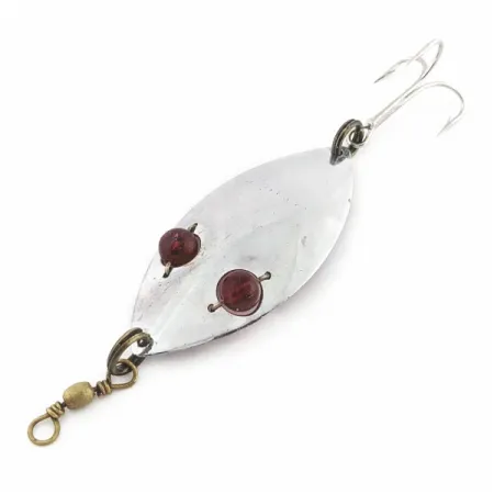 Rote Glasaugen sind das markante Merkmal dieses Blinkers, die bei der langsamen Führung, wie sie im Sommer oft für Hechte nötig ist, als Zielpunkt für Raubfische dienen. Mit einer Länge von 3" (7,5 cm) und einem Gewicht von 1 oz (25 g) ist der versilberte Körper mit dem Namen Hofschneider und der Adresse aus Rochester, N.Y. gestempelt. Die zwei roten Perlen sind durch den Metallkörper fixiert, fangen das Licht ein und imitieren einen verletzten Beutefisch vor dem glänzenden Silberfinish. Auf der Rückseite ist die Patentnummer 1,847,397 eingeprägt. Dieses Exemplar ist im Zustand 4/5 bewertet, hat eine saubere reflektierende Oberfläche und Original-Hardware. Der Blinker ist mit einem Drilling am Schwanzende und einem Wirbel an der Nase ausgestattet. Produktcode 24579.