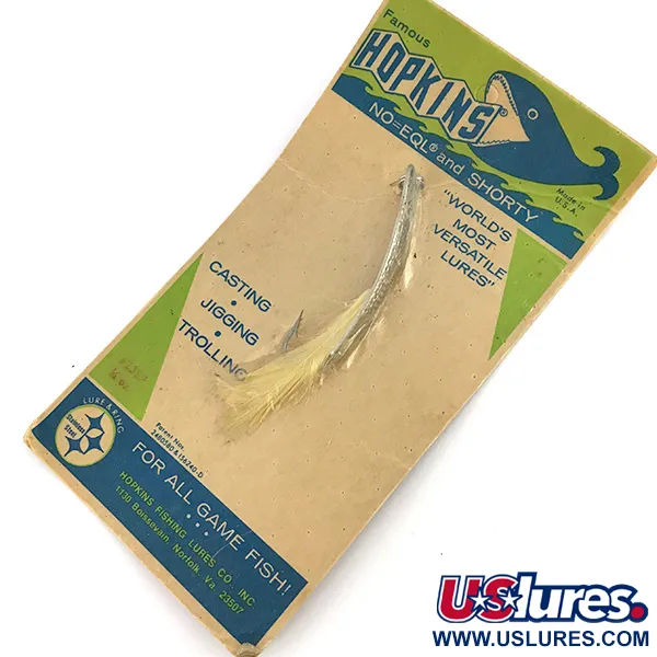 Mit einem Gewicht von 1/4 oz (7 g) verfügt dieses Exemplar über das charakteristische gehämmerte Silber-Finish, das zum Markenzeichen von Hopkins geworden ist. Dieser 2 1/4" (6 cm) lange Blinker ist noch auf seiner originalen Vintage-Karte erhalten und unter dem Produktcode 7694 gelistet. Die strukturierte Oberfläche wurde so entwickelt, dass sie Licht aus verschiedenen Winkeln reflektiert – ein Markenzeichen der „Famous Hopkins“-Serie, die historisch in Norfolk, Virginia, hergestellt wurde. Dieses spezielle 238er Modell ist mit einem Einzelhaken ausgestattet, der mit einem hellen Bucktail-Trailer versehen ist, und befindet sich in unbenutztem Zustand (6). Wie auf der „No-EQL and Shorty“-Verpackung angegeben, wurden diese Köder zum Werfen, Jiggen und Schleppfischen auf alle Raubfische entwickelt. Die Karte hebt die Fertigung aus rostfreiem Stahl hervor, und der Metallkörper selbst ist in der Nähe des Befestigungspunkts mit dem Markennamen geprägt.