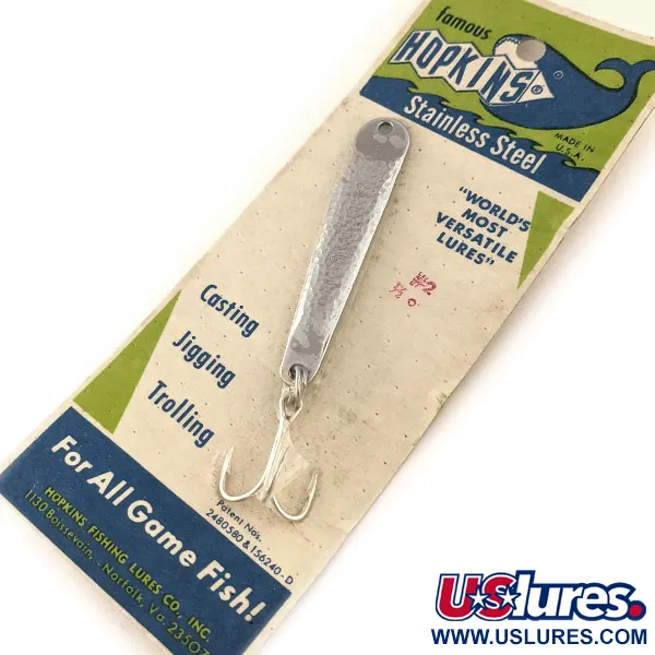 Ein markantes Hammerschlag-Nickel-Finish zeichnet diesen klassischen Hopkins No=Eql Blinker aus, dessen strukturierte Edelstahloberfläche das Licht intensiv reflektiert. Mit einer Länge von 6,5 cm (2 1/2") und einem Gewicht von 14 g (1/2 oz) ist das Modell 11401 aus massivem Edelstahl gefertigt, um ein Abplatzen oder Ablösen der Beschichtung dauerhaft zu verhindern. Dieses spezielle Exemplar ist unbenutzt und befindet sich noch auf der originalen 'famous HOPKINS' Präsentationskarte (Zustand 6). Hergestellt von der Hopkins Fishing Lures Co., Inc. in Norfolk, Virginia, ist der Köder mit einem verzinnten Drilling ausgestattet und mit den Patentnummern 2480380 und 156240-D gekennzeichnet. Die Verpackung betont die Vielseitigkeit zum Werfen, Jiggen und Schleppangeln auf alle Raubfische im Süß- und Salzwasser. Die Rückseite der Karte bietet technische Tipps zur Köderführung und empfiehlt variierende Einholgeschwindigkeiten sowie spezielle Tiefen für das Jiggen an Strukturen wie Brücken oder Pfeilern.