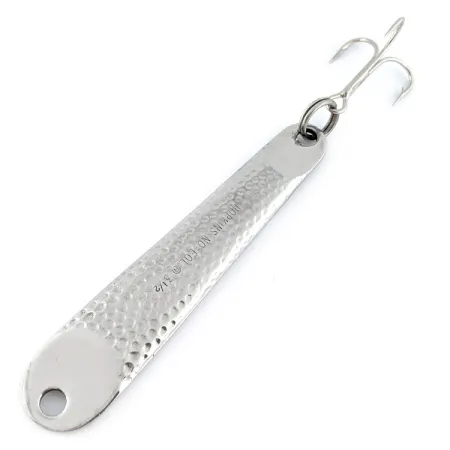 Eine gehämmerte Vernickelung prägt die Oberfläche dieses 60 g schweren Metallköders, ein Design, das 1949 aus R.L. Hopkins' Suche nach einem robusten Salzwasser-Wurfkőder hervorging. Mit einer Länge von 10,5 cm ist der Hopkins No=Eql 3 mit seinem kompakten Profil darauf ausgelegt, zügig tiefes Wasser zu erreichen. Der Körper verfügt über die deutliche Prägung 'HOPKINS NO-EQL @ 3 1/2' auf der strukturierten Vorderseite, die dabei hilft, Lichtreflexionen zu brechen. Sowohl der Drilling als auch der schwere Sprengring befinden sich im Zustand 5/5 und zeigen ein glänzendes, sauberes Erscheinungsbild. Dieser unter dem Produktcode 22591 gelistete Köder besitzt eine einfache Schnuröse an der verjüngten Nase. Seine Konstruktion ist primär auf das Wurf- und Jig-Angeln ausgelegt, bei dem Gewicht und Korrosionsbeständigkeit oberste Priorität haben.