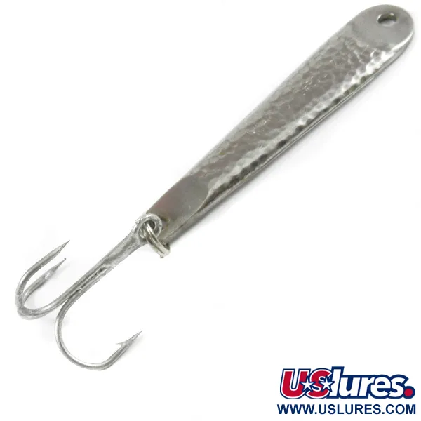 Die Markierung „HOPKINS NO=EQL 2“ ist deutlich in den Metallkörper eingestempelt und weist diesen 6,5 cm (2 1/2") Köder als echtes Stück amerikanischer Angelgeschichte aus. Das Modell 3270 besticht durch sein markantes Hammerschlag-Nickel-Finish, das Lichtstrahlen unter Wasser reflektiert. Mit einem Gewicht von 14 g (1/2 oz) ermöglicht der massive Metallkörper weite Würfe oder präzises Vertikalangeln. Dieses Exemplar befindet sich im Bestzustand (5/5), mit einer glänzenden, sauberen Oberfläche, welche die hochwertige Verarbeitung aus den USA unterstreicht. Am verjüngten Ende hält ein stabiler Sprengring einen scharfen Drillingshaken, während eine einzelne Öse am Kopf als Befestigungspunkt für Snap oder Schnur dient.