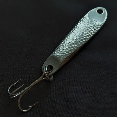 Eine schwere Nickelbeschichtung auf einer gehämmerten Oberfläche zeichnet diesen Hopkins Shorty 225 aus – ein Design, das 1949 entstand, als R. L. Hopkins einen Köder entwickelte, der harten Salzwasserbedingungen standhält. Mit 56 g (2 oz) ist dieser massive Metallköder für extreme Wurfweiten und die Belastbarkeit im Drill mit kapitalen Fischen konstruiert. Die gehämmerte Struktur erzeugt ein markantes optisches Profil auf dem 9 cm (3 1/2") langen Körper, der speziell als Jigging-Köder und nicht als Standard-Blinker konzipiert wurde. Deutlich mit seinem Namen und der Herkunft USA geprägt, befindet sich das Exemplar 21339 im Zustand 5/5 mit glänzenden, reflektierenden Oberflächen und robuster Hardware. Er ist zwar effektiv beim Schleppangeln, wird aber primär als Jig für Arten wie Zander oder Barsch eingesetzt, wobei Bisse am häufigsten in der Absinkphase erfolgen.