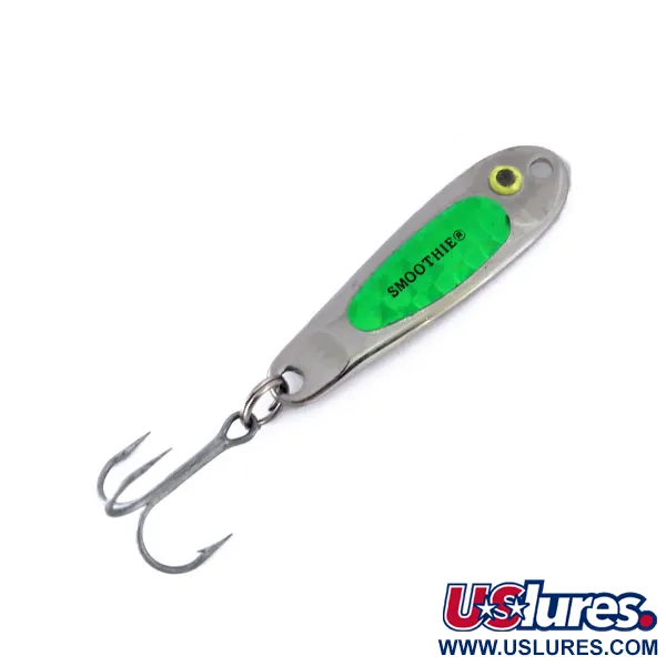 Leuchtkraft definiert die Lockwirkung des grünen Inlays auf diesem vernickelten Blinker, der unter schwachen Lichtverhältnissen oder UV-Bedingungen intensiv leuchtet. Geschmiedet in den USA, verfügt der Hopkins Smoothie (Artikelnr. 10048) über ein strukturiertes „Glow“-Panel, das bei Tageslicht leuchtend grün und in der Tiefe geisterhaft neonfarben erscheint. Mit einer Länge von 6 cm und einem Gewicht von 21 g ist der kompakte Körper für maximale Wurfweiten und das Vertikalangeln konzipiert. Ein kleines Auge mit gelbem Rand nahe der Öse bietet einen Kontrastpunkt zum polierten Metall. Dieses Exemplar befindet sich im Bestzustand (5/5), behält sein originales Werksfinish und ist mit scharfen Drillingen ausgestattet. Das „SMOOTHIE®“-Branding ist deutlich in das fluoreszierende Inlay geprägt.