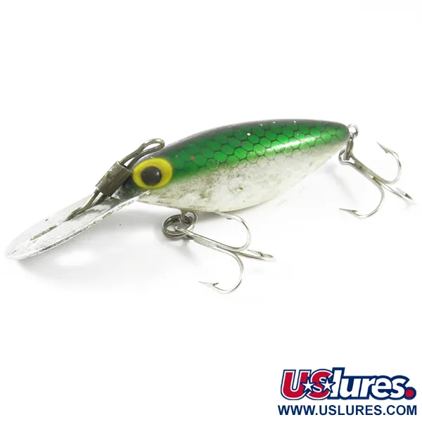 Mit einer Länge von 5 cm und einem Gewicht von 6,5 g zeigt dieses klassische Exemplar das markante grüne Sechseck-Schuppenmuster, das für die frühe Storm-Handwerkskunst typisch ist. Die markante Tauchschaufel aus Metall ist ein charakteristisches Merkmal dieses in den USA hergestellten Storm Hot'N'Tot Thin Fin, der unter dem Produktcode 3592 geführt wird und Tauchtiefen von 1,5 m bis 4 m erreicht. Dieses schwimmende Modell aus der Ära vor Rapala ist auf das Schleppangeln und Wurfangeln auf Zander oder Hecht ausgelegt. Mit einer Bewertung von 4/5 weist der Köder eine leichte Alterung an den silbernen Flanken und einige oberflächliche Spuren an der Hardware auf, was seinen Vintage-Status unterstreicht, während er eine solide Ergänzung für jede Sammlung bleibt. Große gelbe Augen mit dunklen Pupillen sitzen markant über der Schaufel und bieten einen gut sichtbaren Zielpunkt für nachfolgende Raubfische. Die Ausstattung umfasst zwei Drillingshaken und den charakteristischen Einhänger, der direkt durch die Metallschaufel geführt wird.
