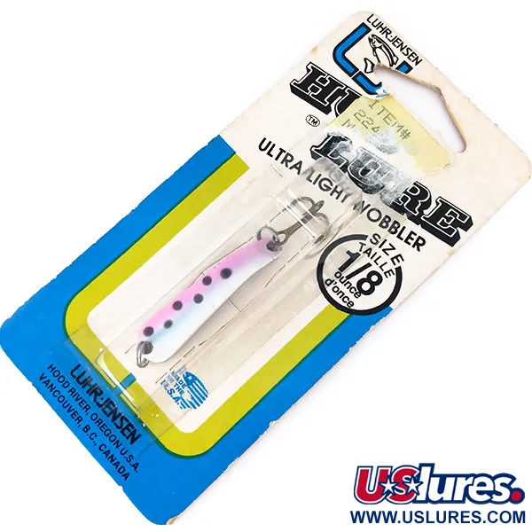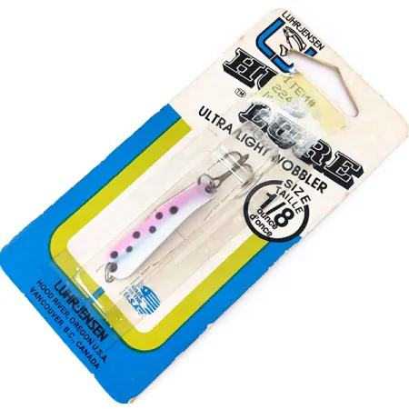 Die Vernickelung dient als reflektierende Basis für diesen 4g (1/8oz) schweren Löffelblinker, der entwickelt wurde, um Oberflächenströmungen zu durchbrechen und tiefer stehende Fische zu erreichen. Dieser Hus-lure mit der Artikelnummer 10383 weist ein Forellen-Dekor mit einem dezenten rosa-violetten Schimmer und markanten schwarzen Punkten auf dem silbernen Körper auf. Der 4cm (1 1/2") lange Körper ist für weite Würfe optimiert und verfügt über ein schmales Profil, das sowohl in Fließgewässern als auch in Stillgewässern stabil läuft. Dieser Köder ist unbenutzt und in der originalen blau-gelben Kartonverpackung aus dem Luhr Jensen Werk in Hood River, Oregon, erhalten geblieben. Er ist mit der originalen Werksausstattung bestückt, einschließlich eines kleinen Sprengrings und eines scharfen, bronzierten Drillings. Jedes Detail, von der sauberen Prägung des Markennamens bis hin zum intakten Blister, spiegelt die Qualität amerikanischer Angelgeräte aus dieser Ära wider.