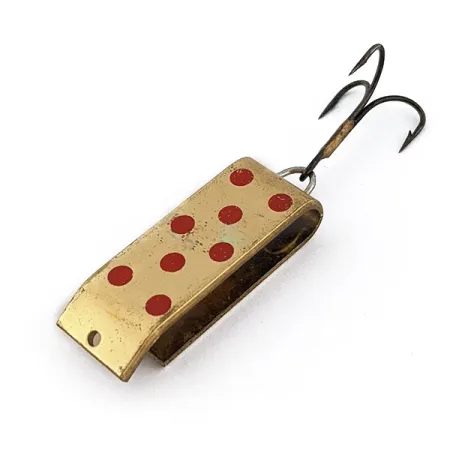Rote Punkte setzen Akzente auf dem klassischen Gold-Finish dieses 3,5 cm langen Vintage-Metallköders. Das Modell mit dem Produktcode 18180 zeichnet sich durch ein einzigartiges Design aus gefaltetem Metall aus, das die Eigenschaften eines Blinkers und eines Spinners kombiniert. Mit einem Gewicht von 9 g ist der Lil Jake optimal für präzise Würfe in Bächen oder Seen ausbalanciert. Dieser in Wyoming gefertigte US-Köder weist moderate Gebrauchsspuren auf, was einem soliden Zustand von 4/5 entspricht. Die Vergoldung des rechteckigen Körpers bewahrt einen hellen Glanz und geht nahe der Schnuröse in eine scharfe Biegung über. Ein nachgedunkelter Drillingshaken ist über einen stabilen Sprengring sicher am Heck befestigt, was die funktionale Schlichtheit der frühen Produktion von Jake's Lures widerspiegelt.