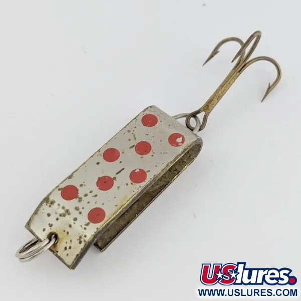 Leuchtend rote Punkte auf einer vernickelten Oberfläche sorgen für einen kontrastreichen visuellen Reiz bei diesem 3,5 cm (1 1/2") langen Metallköder. Jake's Lures hat den Lil Jake mit einem markanten, gefalteten rechteckigen Körper entworfen, der als Hybrid zwischen einem traditionellen Blinker und einem Spinner fungiert. Dieses 9 g (1/3 oz) schwere Modell mit der Artikelnummer 24520 weist ein breiteres und kürzeres Profil als Standard-Blinker auf, um seine Lockwirkung auch bei langsamer Führung oder beim Schleppfischen beizubehalten. Die Dual-Action-Konstruktion erzeugt sowohl Lichtreflexe als auch Vibrationen – eine Kombination, die häufig für Forellen und Lachse in klarem Wasser eingesetzt wird. Bei einer Zustandsbewertung von 4/5 bleiben die gestanzten Metalloberflächen glänzend und die rote Farbe gut erhalten. Die Schnurbefestigung befindet sich am oberen Ring, während eine Drahtschlaufe den Drilling am Boden sichert.