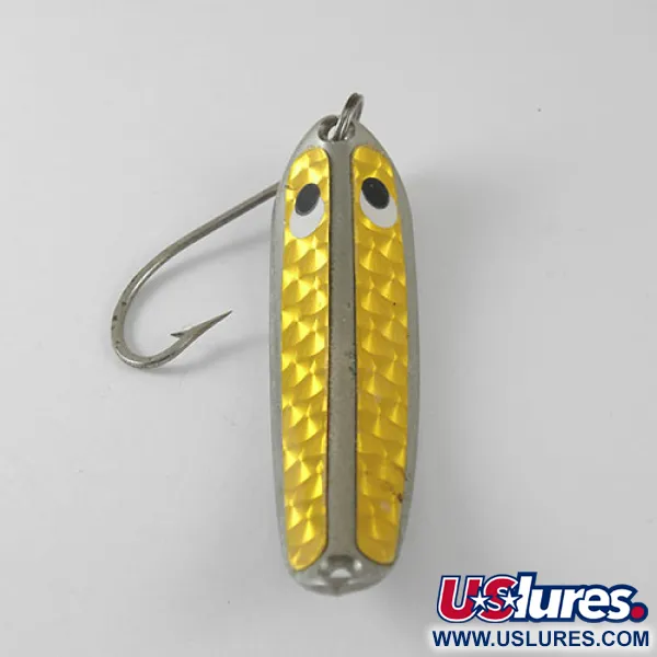 Große, kontrastreiche schwarz-weiße Augen am Kopf des 7 cm langen Körpers bilden einen markanten Fixpunkt für den Jig-A-Whooper Hawgler spoon #6. Dieser Köder von HT Enterprises mit der Artikelnummer 1019 verfügt über einen gebogenen Metallkörper mit einem leuchtend gelben holografischen Schuppenmuster auf der Vorderseite. Die Rückseite zeigt sich in reinem Silber mit eingestempeltem Modellnamen, was seine Herkunft aus den USA unterstreicht. Mit einem Gewicht von 21 g ist der Blinker ideal für das vertikale Jiggen und Präsentationen in tiefem Wasser ausgelegt. Zur Ausstattung gehören ein robuster Einzelhaken, der per Sprengring am Heck befestigt ist, sowie eine vorgebohrte Schnuröse am Kopf. In seinem Zustand (4/5) bleiben die reflektierende Hologrammschicht und die Versilberung für ein Vintage-Exemplar glänzend und gut erhalten.