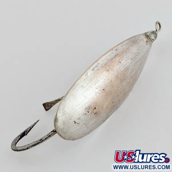 Die echte Versilberung verleiht diesem 5,5 cm langen Blinker einen hellen, weißen Glanz, der sich deutlich von modernen Chrom- oder polierten Stahloberflächen abhebt. Der aus einer schweren Kupfer-Zink-Legierung gestanzte Körper ist mit einer verdickten Mitte konstruiert, um eine stabile Ausrichtung des Hakens während des Einholens beizubehalten. Ein einzelner, feststehender Haken wird durch einen stabilen Draht-Krautschutz geschützt, was effektive Würfe direkt in dichte Vegetation und Seerosen ermöglicht. Im Gegensatz zu zeitgenössischen Versionen stammt dieses Exemplar aus der älteren US-Produktion und trägt die klassischen Herstellerstempel auf der Innenseite. Der Köder weist leichte, ehrliche Altersspuren auf, die seine Reflexionseigenschaften nicht beeinträchtigen, Zustand 4/5. Mit einem Gewicht von 9 g hilft das Design, Schnurdrall zu vermeiden, und bietet genug Masse für präzise Würfe in enge Krautlücken. Dieser Vintage Johnson Silver Minnow Weedless ist unter dem Produktcode 24492 katalogisiert.