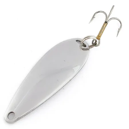Die Vernickelung verleiht diesem tropfenförmigen Blinker eine spiegelnde Oberfläche über den gesamten Körper. Mit einem Gewicht von 10 g (1/3 oz) hat der Metallkörper eine Länge von 6 cm (2 1/4") und verfügt über eine sauber gebohrte Schnuröse am schmaleren Ende. Die konkave Seite des Metalls ist mit „JOHNSON'S SPRITE“ gestempelt, was die Herkunft als echtes amerikanisches Produkt mit dem Produktcode 22446 markiert. Ein stabiler Sprengring verbindet den Drillingshaken, der am Schenkel mit einer markanten messingfarbenen Hülse ausgestattet ist. Jedes Detail an diesem Köder ist präzise ausgearbeitet, von den glatten Kanten des Gusses bis zur glänzenden Nickelfarbe, was zeigt, dass er sich in unbenutztem Zustand befindet. Johnson hat dieses spezielle Profil für den vielseitigen Einsatz entwickelt, ideal sowohl für das Auswerfen an Strukturen als auch für das Schleppen im Freiwasser.