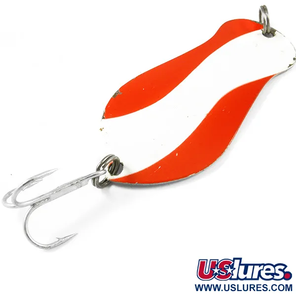Polierter Nickel auf der Rückseite mit einem deutlichen Stempel, der dieses Modell als K-B Amasa, Mich. Größe 2 ausweist. Mit einer Länge von 6,5 cm (2 1/2") und einem Gewicht von 14 g (1/2 oz) ist der K-B Spoon 2 ein robuster Teil der Angelgeschichte Michigans, der unter US-Anglern als Garant für kapitale Fänge gilt. Die konvexe Vorderseite ist mit einem klassischen rot-weißen Wellenmuster auf reinweißem Grund verziert – ein kontrastreiches Dekor, das gezielt für Hechte und Muskies bei unterschiedlichen Sichtverhältnissen entwickelt wurde. Unter der Artikelnummer 3263 behält dieser Blinker seine originalen Komponenten, einschließlich zweier kräftiger Sprengringe und eines scharfen, silbernen Drillings. Dieses Exemplar befindet sich in einem exzellenten Zustand und erhält eine 5/5-Bewertung für den gut erhaltenen Lack und das reflektierende Metallfinish. Hergestellt von der K-B Bait Co. in den USA, eignet sich die solide Bauweise sowohl zum Werfen als auch zum Schleppen. Die eingestempelte "2" auf der Rückseite entspricht der Größenklassifizierung, die in der Werkstatt in Amasa während der Produktionsjahre verwendet wurde.