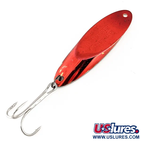 Ein markantes zweifarbiges Finish in Rot und Gold zeichnet diesen speziellen 1oz (28g) Acme Blinker aus. Die Vorderseite verfügt über eine leuchtend rote Beschichtung mit der deutlich sichtbaren "KASTMASTER ACME LURE" Prägung im Metall, während die Rückseite eine polierte gold-messingfarbene Oberfläche offenbart. Mit einer Länge von 2 3/4" (7cm) ist das schwere, aerodynamische Profil dieses Modells 11236 für weite Würfe und Anwendungen im tiefen Wasser konzipiert. Der Köder ist mit einem sauberen, silbernen Drillingshaken ausgestattet, der an einem robusten Sprengring befestigt ist. Die Verwendung einer speziellen Legierung durch Acme bei der Herstellung in den USA gewährleistet eine präzise Balance, ein Detail, das Originale von einfachen Kopien unterscheidet. Dieser spezielle Köder befindet sich in einem exzellenten Zustand (5/5), mit einem sehr gut erhaltenen Finish und scharfen Hakenspitzen. Die kompakte Bauweise macht ihn zu einer effektiven Wahl für Angler, die Raubfische in starken Strömungen bejagen, wo das Halten der Tiefe entscheidend ist.
