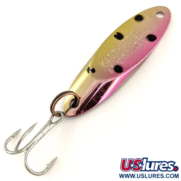 Die Nickelbeschichtung bildet die Grundlage für diesen 4,5 cm (1 3/4") langen Blinker, dessen Oberseite einen markanten Regenbogenforellen-Farbverlauf aufweist. Die Prägung „KASTMASTER ACME TACKLE CO.“ belegt die Herkunft aus den USA und spiegelt die Verarbeitungsqualität der originalen Messinglegierung wider. Mit einem Gewicht von 7 g (1/4oz) ist dieses Modell mit dem Produktcode 12312 auf Vielseitigkeit ausgelegt und wird häufig sowohl für das Tiefwasser-Jiggen als auch für das normale Einkurbeln in der Strömung eingesetzt. Das Finish besticht durch einen fließenden Übergang von Goldgelb an der Nase zu einem kräftigen Pink am Schwanz, ergänzt durch fünf schwarze Punkte, die einen Jungfisch imitieren. Der Zustand ist mit 5/5 bewertet, mit einer sauberen, hochglanzpolierten Nickel-Unterseite und einem scharfen Original-Drilling. Das spezifische Verhältnis zwischen Metalldicke und verjüngtem Schnitt definiert den Acme-Standard der Serie und stellt sicher, dass der Köder in der Absinkphase wie gewünscht spielt. Ein stabiler Sprengring sichert die silberfarbenen Komponenten, während das Öhr für die Schnurmontage frei von Rückständen ist.