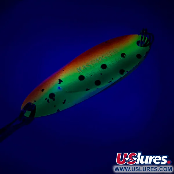 Mit einem Gewicht von 3/4 oz (21 g) schwer genug für extreme Weitwürfe, bietet der markante Schrägschnitt dieses Acme-Metallblinkers ein Profil, auf das sich Angler seit Generationen verlassen. Dieses spezielle Exemplar mit dem Produktcode 6054 hat eine Länge von 2 1/2" (6.2 cm) und besticht durch ein wunderschön erhaltenes Regenbogenforellen-Dekor. Der Farbübergang verläuft von einer leuchtend orangefarbenen Kante über ein sonniges Gelb bis hin zu einem lebhaften Grün, abgerundet durch präzise gesetzte schwarze Punkte. Auf der Rückseite ist das hochreflektierende Nickel-Finish sauber und glänzend erhalten. In die Metallfläche eingestempelt sind die Worte "KASTMASTER ACME TACKLE CO.", was seine Herkunft aus den USA und seine technische Tradition unterstreicht. Die strukturelle Integrität ist mit einer Zustandsbewertung von 5/5 außergewöhnlich, mit gut gepflegten Sprengringen und einem scharfen Drillingshaken. Seine ausgewogene Legierung wurde speziell für Stabilität beim Jiggen oder beim Einholen in starker Strömung entwickelt.