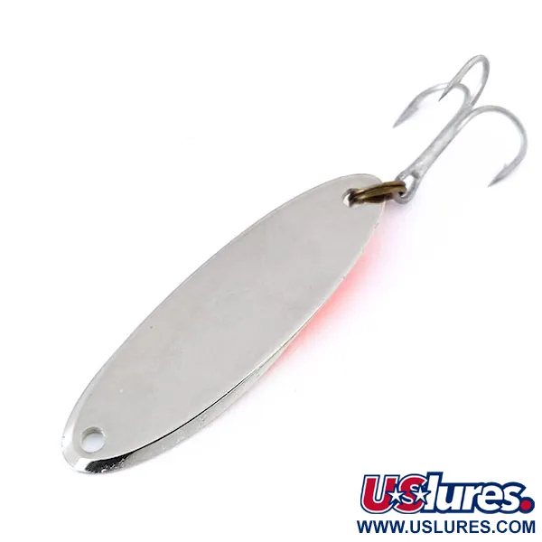 Mit 1/2 oz (14 g) ist das Gewicht dieses Blinkers perfekt ausbalanciert, um die Tiefen zu erreichen, in denen große Raubfische jagen. Der Acme Kastmaster Glow, Artikelnummer 10495, besticht durch ein auffälliges Split-Face-Design auf seiner Länge von 2 1/4" (5.7 cm). Eine Hälfte der Oberfläche ist in kräftigem Orange mit einem einzelnen rosa Punkt gehalten, während die andere Hälfte mit einer speziellen lumineszierenden cremefarbenen Farbe beschichtet ist. Wie das zweite Bild zeigt, erzeugt dieser cremefarbene Bereich bei Aufladung ein hellgrünes Leuchten, das bei schlechten Lichtverhältnissen oder in tiefem Wasser einen optischen Fixpunkt bietet. Die Rückseite des Köders besteht aus poliertem Nickel und sorgt für klassischen metallischen Glanz. Dieses Exemplar befindet sich im Zustand 4/5 und weist gut erhaltene Farbe sowie die Original-Hardware auf, einschließlich der sicheren Sprengringe und eines silbernen Drillings. Die markante, verjüngte Form des Köders ermöglicht es ihm, seine Bahn auch in starken Strömungen effektiv beizubehalten.