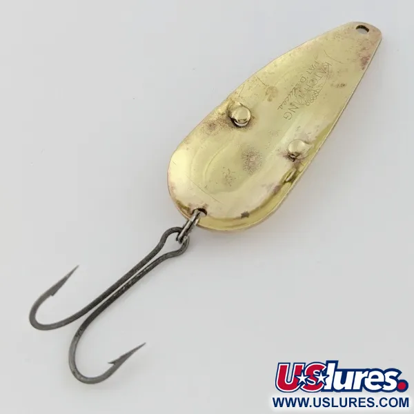 Dieser Messingblinker mit der Prägung „Katch King“ und dem Patentdatum von 1958 zeigt den cleveren Ansatz des Mid-Century für vielseitiges Angeln. Das Hammerschlag-Finish auf der konvexen Seite sorgt für deutliche Reflexionen, während die Länge von 4,5 cm eine handliche Größe für verschiedene Süßwasserarten darstellt. Dieser 7 g schwere Köder (Artikelnummer 24529) verfügt über ein innovatives Hakensystem, das es dem Angler ermöglicht, zwischen der Aktion eines Standardblinkers und einer krautsicheren Präsentation zu wechseln, indem der Haken unter den integrierten Clips fixiert wird. Die zwei Messing-Haltestifte auf der konkaven Seite sind der Schlüssel zur Weedless-Funktionalität. Mit einer Zustandsbewertung von 4/5 bleibt die Messingoberfläche hell und weist nur geringe Altersspuren auf. Jedes Detail, von der Tropfenform bis zur spezifischen Hakenbefestigung, spiegelt das zweckorientierte Design dieser Ära wider.