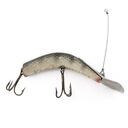 Ein Gewicht von 7 g verleiht diesem schwimmenden Holzköder die nötige Masse für präzise Würfe, während der charakteristische Auftrieb des Materials erhalten bleibt. Mit einer Länge von 6 cm weist der Körper ein sorgfältig aufgetragenes grau-schwarzes Schuppenmuster auf, das in einen helleren Bauch übergeht, auf dem der Markenname „Kautzky Deep Ike“ lesbar bleibt. Dieses spezifische Modell, Artikelnummer 22633, ist mit einer markanten Tauchschaufel aus Metall und einem originalen Drahtvorfach ausgestattet, was auf seinen Einsatz im Tiefwasser hinweist. Das Finish zeigt leichte Spuren der Zeit, was zu einer Zustandsbewertung von 4/5 führt, die den gut erhaltenen Zustand und die authentische Optik unterstreicht. Zwei scharfe Drillinge sind mit der Originalmontage sicher am Holzkorpus befestigt. Ein roter Farbakzent im Kehlbereich setzt einen klassischen optischen Kontrast zu den metallischen Silber- und Grautönen des Körpers.