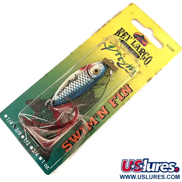 Regenbogenfarbene hellblaue Fischschuppen schimmern auf dem 4,5 cm (1 3/4") langen Körper dieses Key Largo Swim'n Fin, einem Vintage-Metall-Jig mit dem charakteristischen holografischen Prizm Image-Finish des Herstellers. Dieses spezifische Exemplar mit dem Produktcode 11290 wiegt 11 g (2/5 oz) und wurde in der Dominikanischen Republik aus US-Komponenten gefertigt. Das Design umfasst ein realistisch geformtes 3D-Auge und einen robusten Tönnchenwirbel an der Nase für eine sichere Schnurverbindung. Am Heck verleiht ein handgebundener Federdrilling dem silber-blauen Profil einen roten Akzent. Da er unbenutzt in der Original-Blisterverpackung geliefert wird, befindet sich der Köder in makellosem Zustand. Die in Ft. Myers, Florida, ansässige Marke hat den Swim'n Fin mit einem stromlinienförmigen Profil entwickelt, um kleine Futterfische bei verschiedenen Auswurf- oder vertikalen Jigging-Techniken zu imitieren.
