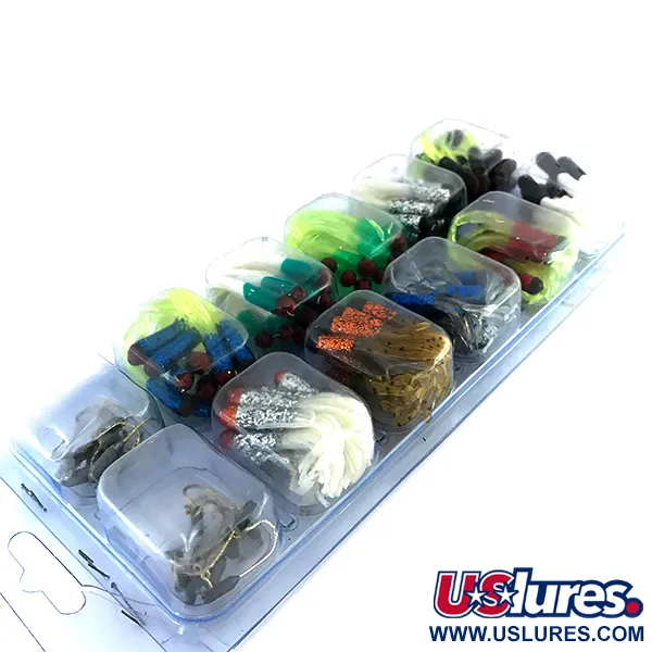Dieser werkseitig versiegelte Organizer ist in zehn separate Fächer unterteilt und enthält eine umfassende Auswahl an 5 cm (2") langen Soft-Skirts im Octopus-Stil. Das Sortiment bietet eine vielfältige Farbpalette, darunter Blau, Rot, Gelb, Grün, Silber, Gold, Schwarz und Braun. Fünf spezifische Fächer enthalten UV-aktive Köder, die für eine bessere Sichtbarkeit bei schlechten Lichtverhältnissen oder in tieferen Wasserschichten sorgen. Das in den USA von Creme hergestellte Set ist speziell für das Jiggen konfiguriert. Jedes Fach enthält 10 einzelne Maxi Tails, was insgesamt 100 Köder ergibt, zusammen mit 19 sortierten Bleiköpfen im oberen Bereich der Box. Das unter der Artikelnummer 8368 geführte Set bietet sowohl kontrastreiche Vollfarben als auch Varianten mit feinem Glitter für zusätzlichen Lockreiz. Als unbenutzter Artikel in der Originalverpackung erhält dieses Exemplar eine Zustandsbewertung von 6.