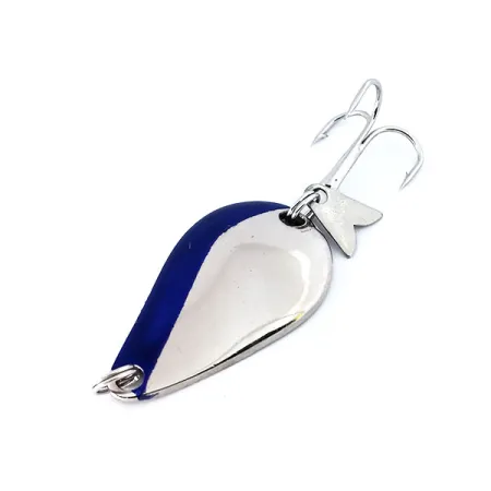 Mit der Prägung „K.O. WOBBLER“ auf der Rückseite besticht dieser Blinker durch einen hochglanzpolierten Nickel-Körper, der an einer Kante mit einem tiefvioletten Streifen versehen ist. Mit einem Gewicht von 7 g (1/4 oz) und einer Länge von 3,5 cm (1 1/2") verfügt der Köder über Acmes „Sonic flipper tail“ – eine kleine, herzförmige Metallflosse am hinteren Sprengring. Dieses mechanische Detail erzeugt bei der Seitwärtsbewegung des Köders Schallwellen und bietet so neben dem optischen Reiz einen zusätzlichen akustischen Lockeffekt. Der Drillingshaken und die Sprengringe befinden sich in erstklassigem Zustand (Bewertung 5/5). Hergestellt in den USA unter dem Produktcode 10355, sind die Nickelbeschichtung glänzend und der Farbakzent scharf, was dem ursprünglichen Werkszustand entspricht.