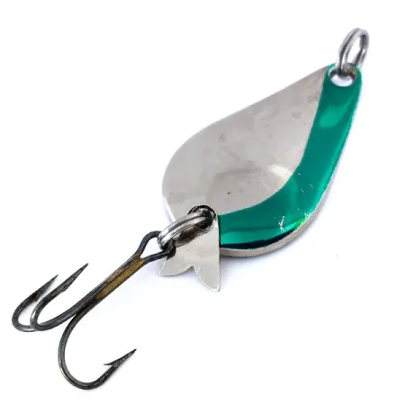 Nickel- und smaragdgrüne Oberflächen verbinden sich bei diesem 7g (1/4oz) Wurfpilker zu einem kontrastreichen visuellen Profil. In den USA hergestellt, verfügt dieser Acme K.O. Wobbler über einen tropfenförmigen Körper mit einer Länge von 3,5 cm (1 1/2"). Ein markantes physisches Merkmal ist der „Sonic flipper tail“-Aufsatz in der Nähe des hinteren Sprengrings, ein Konstruktionselement, das entwickelt wurde, um spezifische akustische Frequenzen zu erzeugen, während es sich durch die Wassersäule bewegt. Auf der Rückseite sind die Prägungen „K.O. WOBBLER“ und „1/4“ für das Gewicht deutlich im Metall zu sehen. Sowohl die polierte Nickeloberfläche als auch der lackierte grüne Akzentstreifen sind bemerkenswert sauber und spiegeln einen Erhaltungszustand von 5/5 wider. Die Montage besteht aus einem Drillingshaken, der über einen Sprengring am Ende befestigt ist, sowie einem zusätzlichen Sprengring an der Schnuröse. Dieses spezielle Exemplar, katalogisiert unter dem Produktcode 10641, bewahrt seinen ursprünglichen Werksglanz und die scharfe Prägung.