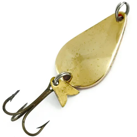Eine hochglänzende Goldbeschichtung ziert die Vorderseite dieses in den USA hergestellten Löffelblinkers und sorgt selbst in trübem Wasser für eine starke Lockwirkung. Der Acme K.O. Wobbler UV mit der Artikelnummer 5758 ist ein kompakter Wurköder mit einem Gewicht von 7 g (1/4 oz) und einer Länge von 3,5 cm (1 1/2"). Ein besonderes Merkmal dieses Modells ist der kleine metallische „Sonic Flipper Tail“, der am hinteren Sprengring befestigt ist und während des Einholens für zusätzliche seitliche Bewegungen sorgt. Während die Vorderseite in Gold gehalten ist, besitzt die Rückseite ein leuchtendes, fluoreszierendes Orange-Finish, das unter UV-Licht intensiv reagiert, wie die speziellen UV-Aufnahmen zeigen. Das Exemplar befindet sich in einem ausgezeichneten Zustand (Bewertung 5/5), wobei die beschichtete Oberfläche sauber reflektiert und die Montage keinerlei Alterungserscheinungen zeigt. Dieser in den USA gefertigte Köder ist mit einem stabilen Drilling und robusten Sprengringen ausgestattet, um beim Fang verschiedener Raubfischarten maximale Haltbarkeit zu gewährleisten.