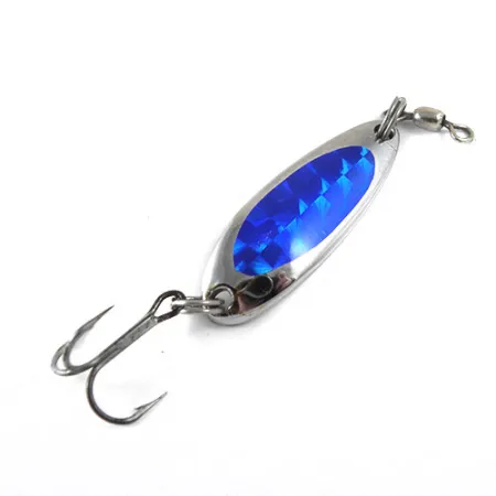Mit einem Gewicht von 9 g (1/3 oz) ist dieser kompakte Blinker ein klassisches Beispiel für die Vielseitigkeit, die Luhr Jensen in die Krocodile-Serie integriert hat. Dieses 4 cm (1 1/2 Zoll) lange Modell (Artikelnummer 0872) besticht durch ein hochglanzpoliertes Nickel-Finish in Kombination mit einem leuchtend blauen, prismatischen Schuppen-Inlay, das das Licht durch ein geometrisches, holografisches Muster einfängt. Hergestellt in den USA, ist das Design robust und auf maximale Wurfweite ausgelegt, sodass Sie mühelos tiefes Wasser erreichen oder Gegenwind durchbrechen können. Die Ausstattung ist ebenso zuverlässig und umfasst einen werkseitig montierten Wirbel am Kopfende zur Vermeidung von Schnurdrall sowie einen scharfen Drillingshaken am Heck. Der Zustand dieses Köders ist außergewöhnlich sauber; die Nickelbeschichtung und die blaue Klebefolie sind vollständig intakt und glänzend, was eine Bewertung von 5/5 rechtfertigt. Der Krocodile ist technisch so konzipiert, dass er bei verschiedenen Einholgeschwindigkeiten ein gleichmäßiges Spiel beibehält, egal ob Sie von einer Mole aus werfen oder im Freiwasser schleppen.